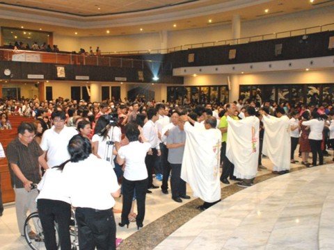 Serat-serat lampu menembus deretan umat yang sedang berdiri untuk menerima berkat ulang tahun kelahiran dan perkawinan dalam Misa pesta nama …Read More